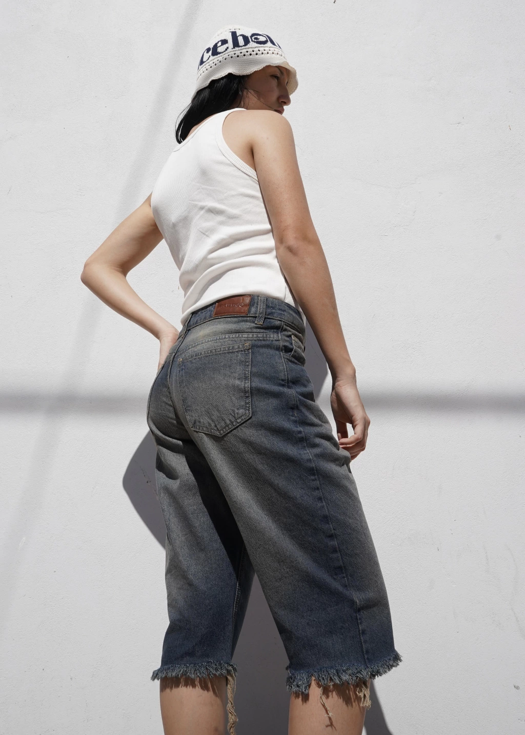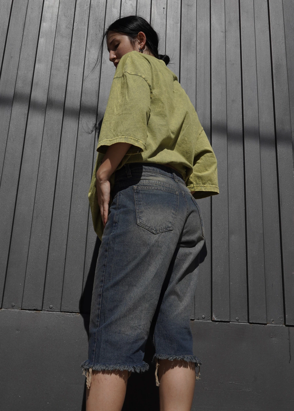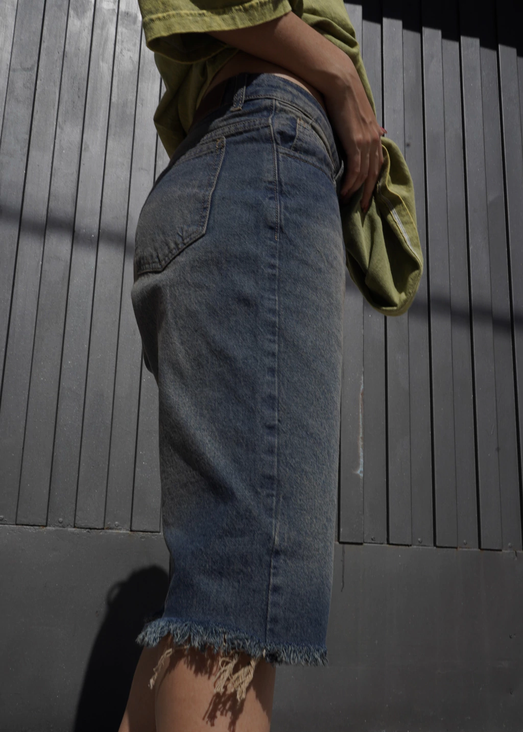 Bermuda de jean tiro medio. Confeccionado con denim rígido algodón. Tiene 2 bolsillos delanteros y 2 bolsillos traseros. Está teñida y tiene un proceso de lavado, arenado, que le a efecto único.